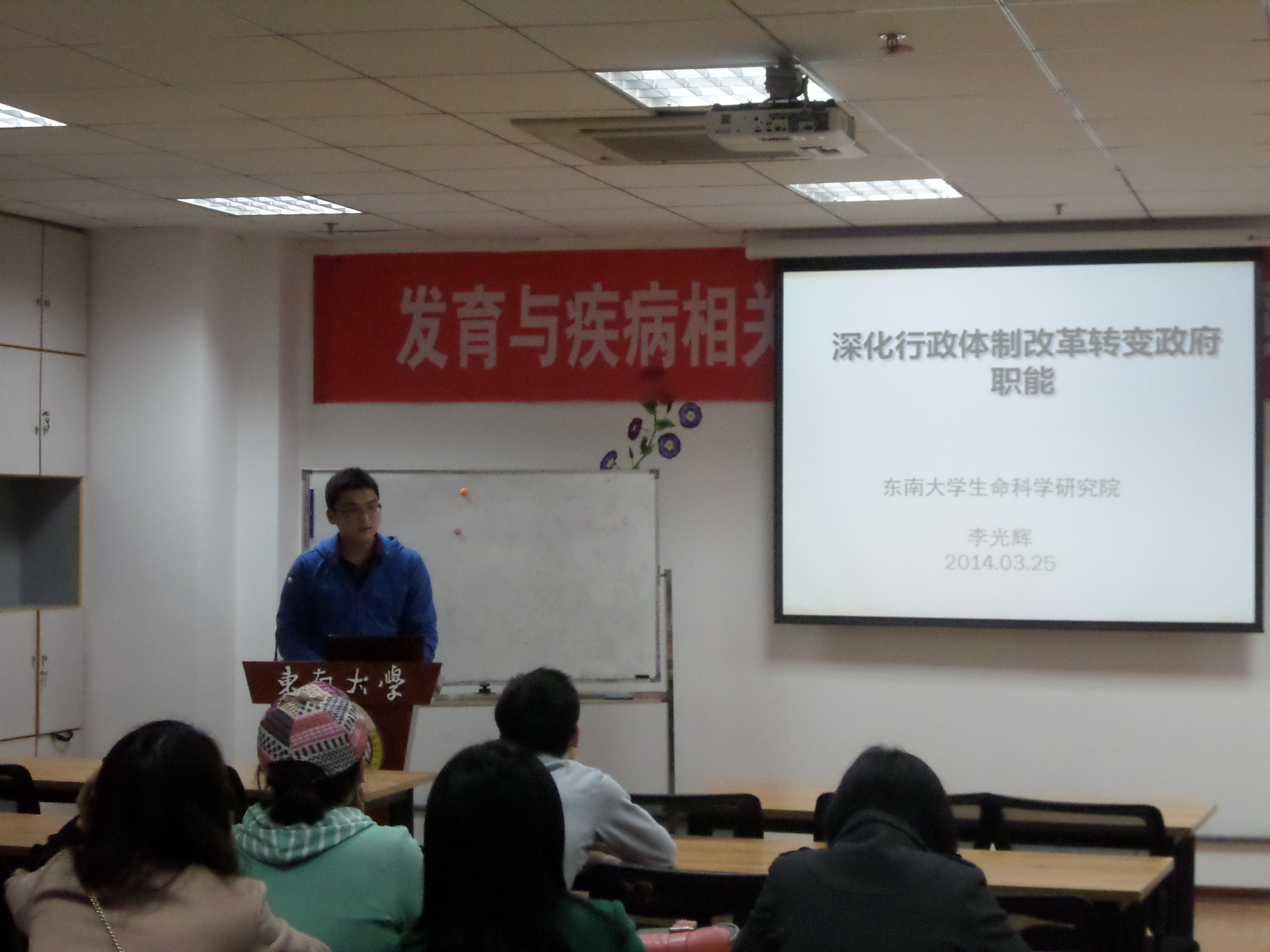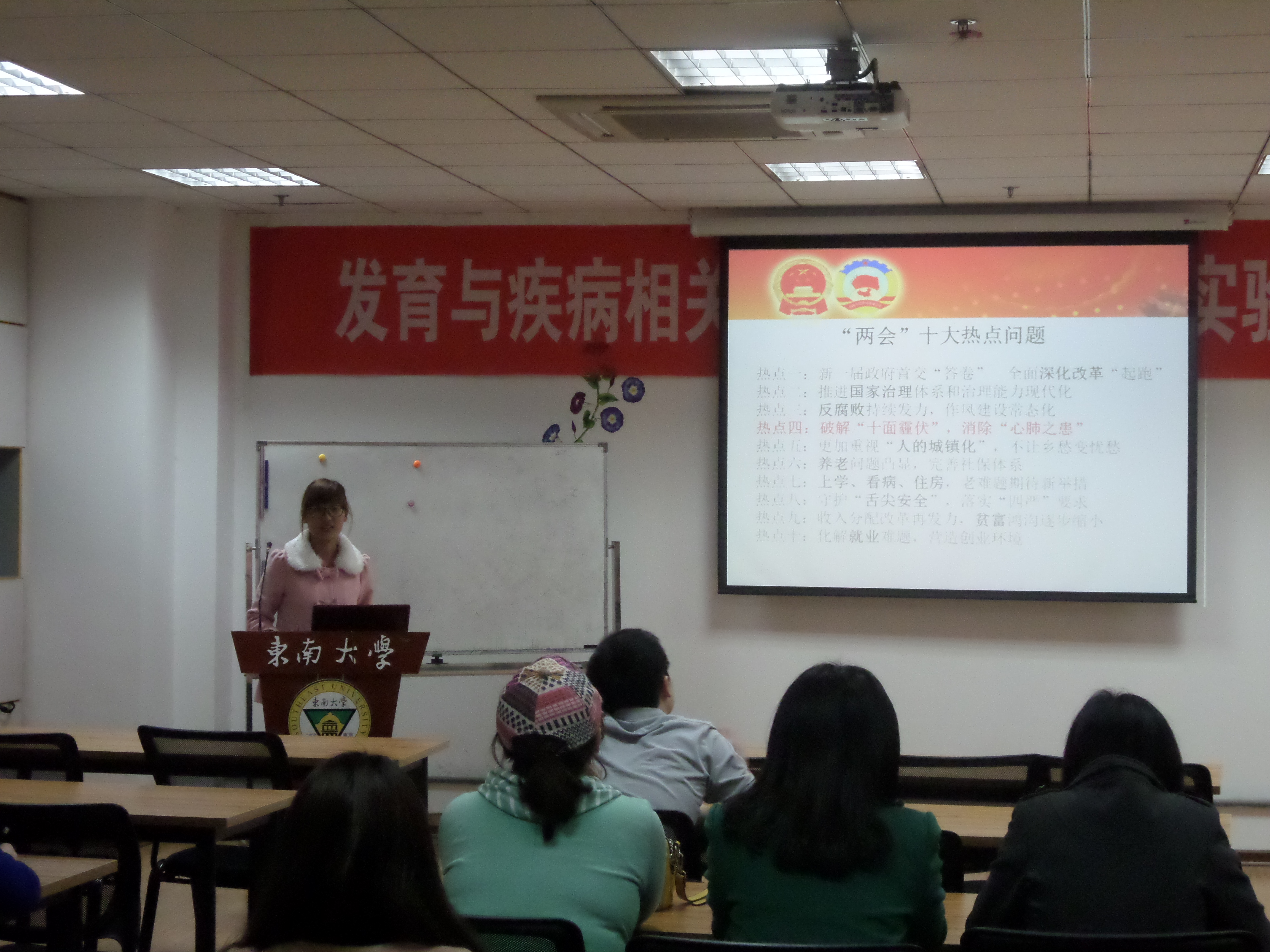2014年3月25日晚,生命科学研究院2012级研究生党支部在李文正楼南楼213组织全体党员、入党积极分子举办“十二届二次全国人大、全国政协会议”学习汇报活动。会议由董茗主持,李倍、李小伟、李光辉和强倩同学进行了汇报,同学们就四位同学有关于的雾霾、环境问题及治理、反腐倡廉以及行政体制改革的汇报展开了热烈的学习与讨论。