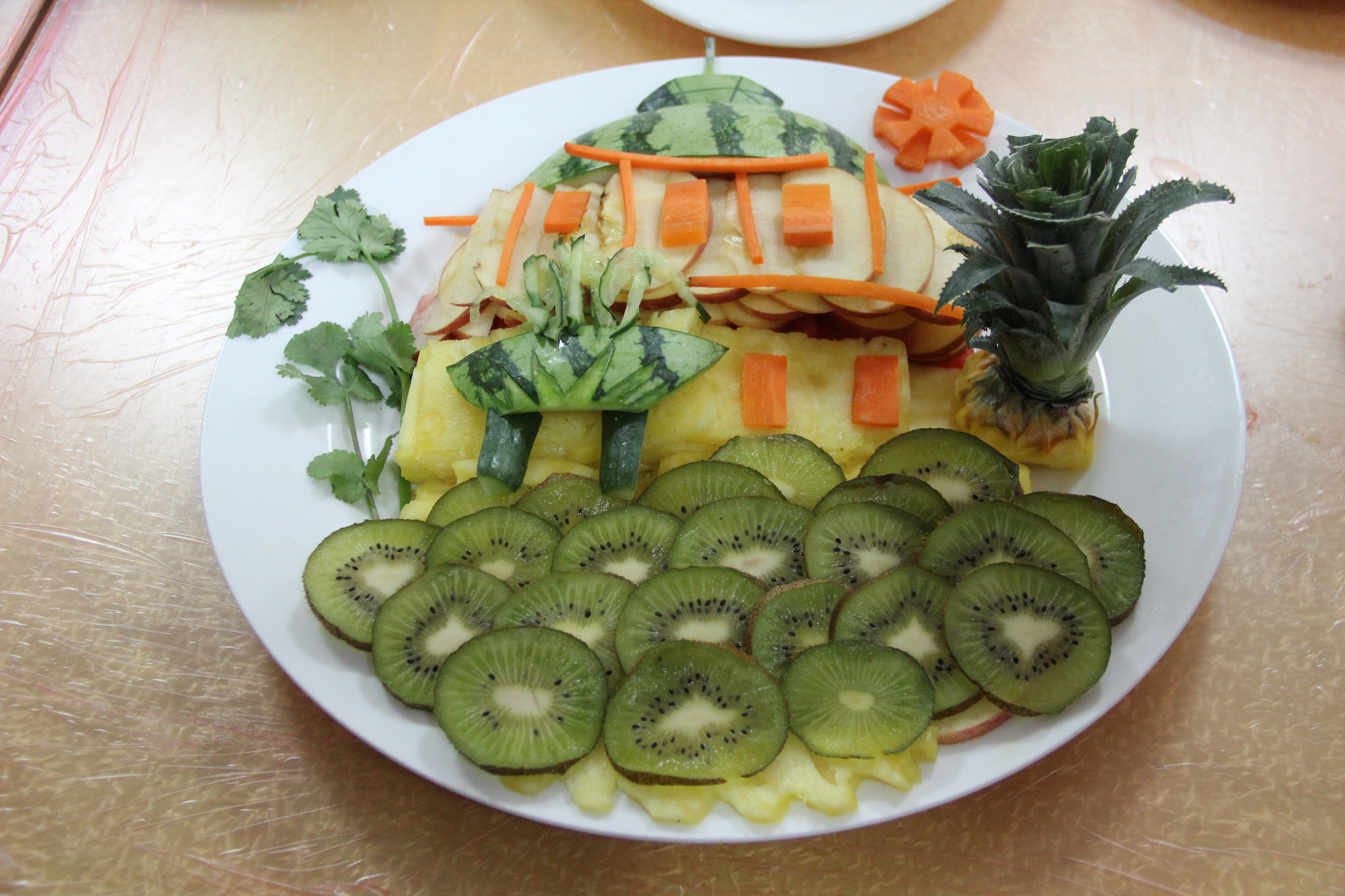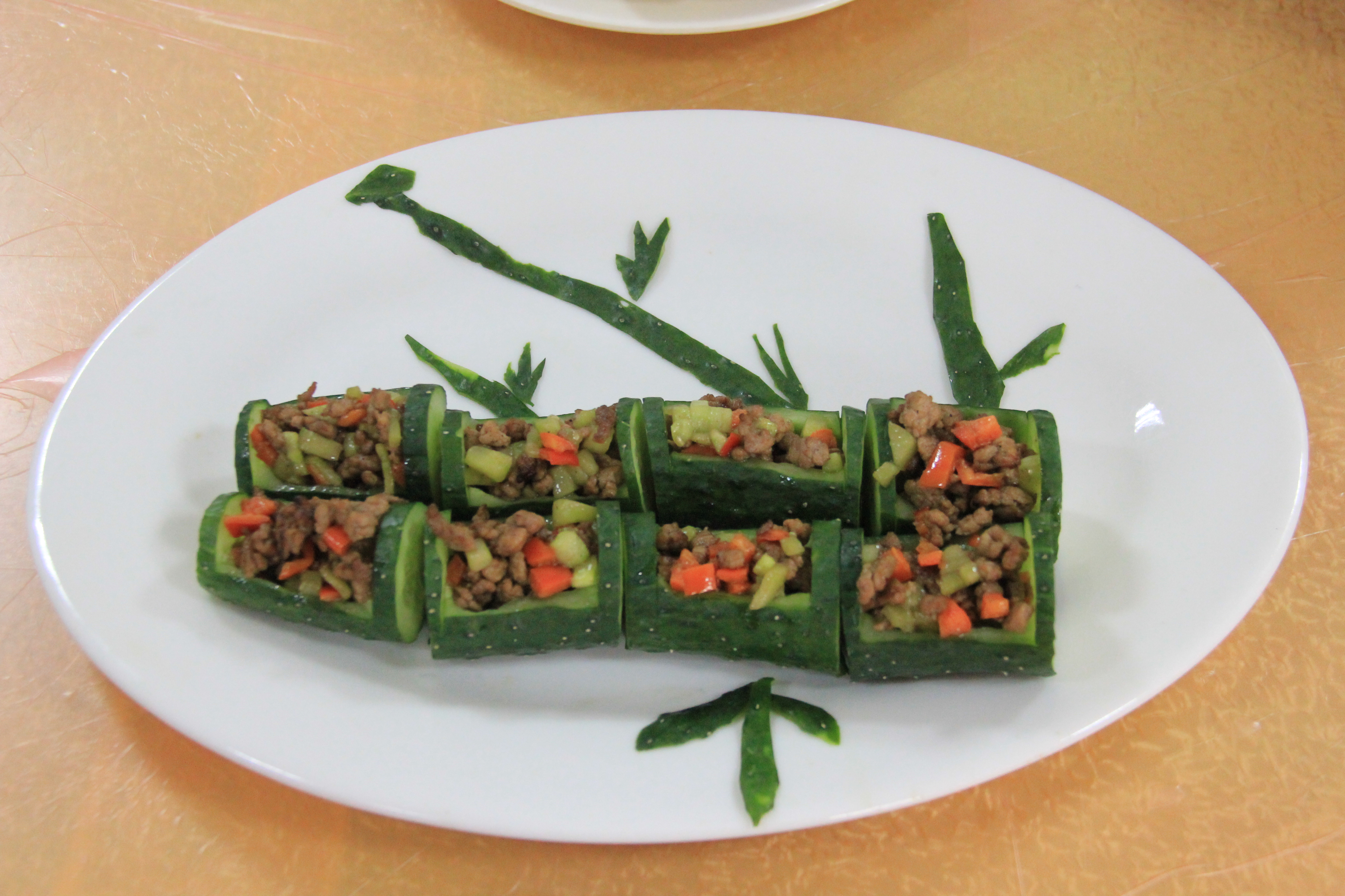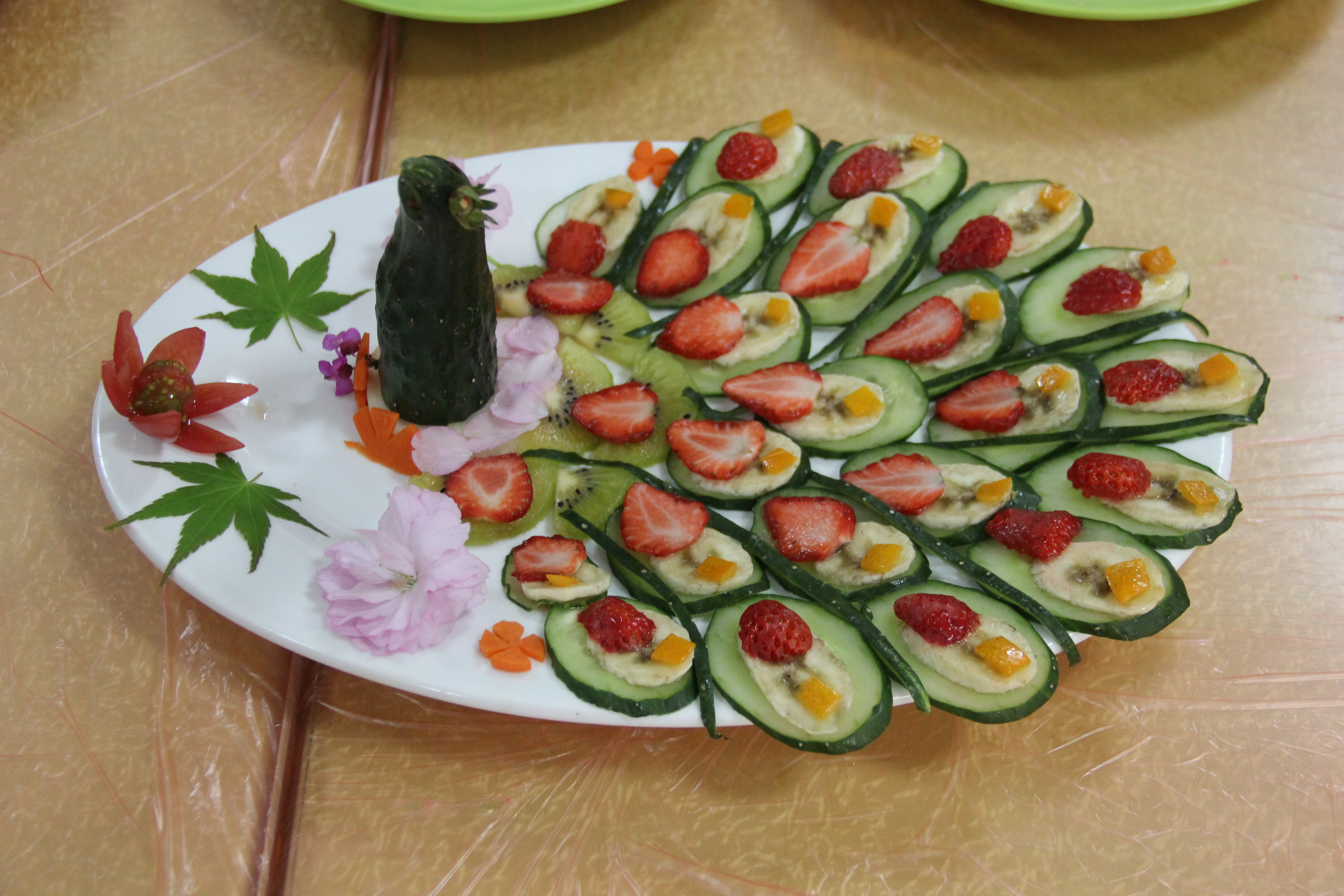 时间在欢乐的气氛中很快过去了,一盘盘的佳肴被选手们呈了上来。其中有吃起来像肉的茄子,甜软香糯的大红枣包糯米,有好吃的秧菜,有简单又可口的凉拌菜,有好听的菜名同时又好吃的漠漠水田飞白鹭,有摆盘精美的梅花三弄,有令大家停不下筷子的猪里脊,有火候到位的啤酒鸭,有预示着节节高的可口菜肴,有酸甜可口的纵想丝滑,各种美食美不胜收,令所有人赞不绝口,争先品尝。同时还有各种创意的水果拼盘,无论是从造型,创意,还是刀工都值得大家竖起大拇指,说个棒字,顺便点个赞。在活动的最后,我们更是把此次大赛的水果拼盘作品在沙塘园食堂一楼展示给所有的学生看,令许多同学留步,更有许多同学情不自禁的拿出了手机拍照留念。