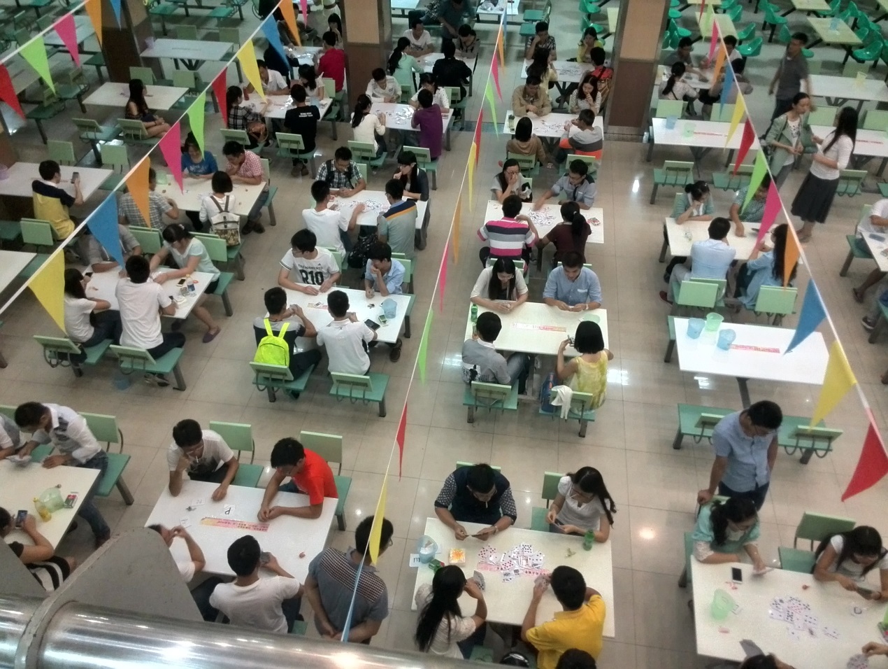 2014年9月21日19点,太阳成集团生科&电子联合掼蛋大赛在沙塘园餐厅学生就餐区成功举办。此次大赛由生命科学研究院研究生会&电子工程学院研究生会联合承办,也是生命科学研究院新一届研会组织的首场活动。本次活动得到了广大老师和同学们的支持,各个院系的同学们踊跃报名、积极参赛,与此同时,还吸引了很多不会掼蛋的同学前来围观和交流。36组选手牌技高超,角逐激烈,各组实力不相上下。本次活动的主题是收获友谊,因此,在比赛开始之前各组选手有五分钟互相认识以及互留联系方式的时间。本次大赛以抽签的形式开始比赛,抽到相同号码的参赛选手为一组,不仅体现了公平公正的比赛态度,还体现了友谊联赛中的“缘分”情节。第一轮实行淘汰制,取前十六名进入下一轮。获胜组继续比赛,淘汰组到休息区可以聊天,或继续掼蛋以及其他纸牌游戏。主办方还为大家准备了糖、话梅等各种零食小吃,各个院系的同学们有说有笑,气氛融洽,不亦乐乎!最终进入半决赛的四个小组,技艺精湛,手法娴熟,正所谓巾帼不让须眉,电子院的两名女同学获胜杀进决赛,比赛进入白热化,最终进行加时赛决出胜负,信息学院的王恒康、邵阳赢得桂冠,金月、田伟娜斩获亚军,张俊、贾建宇、顾凯、陈辉荣获季军。进入半决赛的四组选手获得了移动电源、8G优盘、太阳成集团纪念杯等丰厚的奖品。
