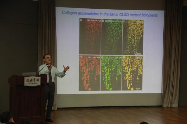 讲座伊始,生命科学研究院谢维院长隆重介绍了本次人文与科学素养大讲座的嘉宾2013年诺贝尔生理学或医学奖获得者RandyW.Schekman教授及其对生命科学领域做出的贡献。接着,Schekman教授用生动、幽默、专业的语言介绍了能控制细胞传输系统不同方面的三类基因。他解释道,生物体内每一个细胞都是一个生产和输出分子的工厂。比如,胰岛素在这里被制造出来并释放进入血液当中,神经传递素从一个神经细胞传导至另一个细胞。这些分子在细胞内都是以“小包”的形式传递的,这就是“细胞囊泡”。他发现了这些“小包”是如何被在正确的时间输运至正确地点的分子机制。由于话题贴近学生们的科研生活,现场反响热烈,大家在Schekman教授的报告中领悟到如何搞科研、爱科研的精神。