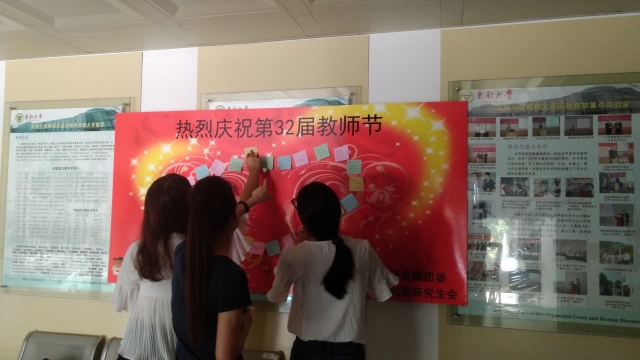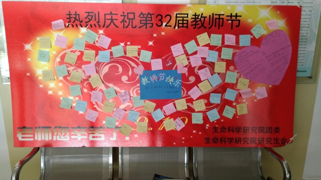 2016年9月10第32个教师节来临之时,生命科学研究院党政工举办了简洁又温馨的教师节庆祝系列活动,9月8日组织教职工去鼓楼荔枝广场观看电影,通过放松大家的身心健康迎接教师节的到来。9月9日组织新媒体工作人员开发了反映我院2015-2016学年生科院教师在人才培养和人才建设、科学研究等方面取得的成就的庆祝教师节微信专版,激励大家在太阳成集团的教师舞台上扎根教育事业实现自己的美好人生梦想,为太阳成集团的“双一流”建设作出我们应有的贡献。院研究生会制作了喜气的签名祝贺墙,组织我院全体研究生为老师送上了一份温馨祝福。祝福各位老师节日快乐!祝福大家明天会更美好!