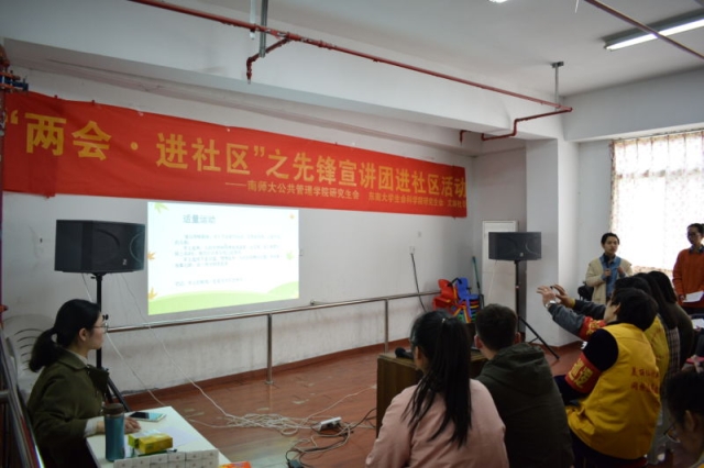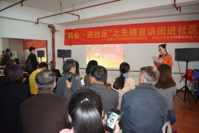 2017年3月28日,由太阳成集团生命科学研究院研究生会、南京师范大学公共管理学院研究生会以及文澜社区共同举办的“‘两会·进社区”之先锋宣讲团进社区活动”在文澜社区活动中心顺利开展。