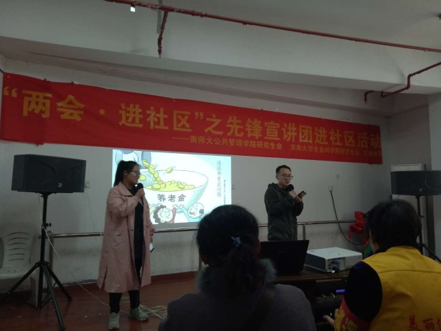 首先,我院宣讲员胡蝶、车转转就医疗改革问题进行了题为《关注医疗新政》的PPT演示讲解;其次,南京师范大学公共管理学院宣讲员武超进行了《浅析养老金问题》的报告,宣讲结合音视频以及优秀的表达能力,使得文澜社区居民对于养老金问题有了更详细的了解;最后,宣讲员张栗娟声色并茂地展示了PPT《社区服务》并对于观众问题予以解答。