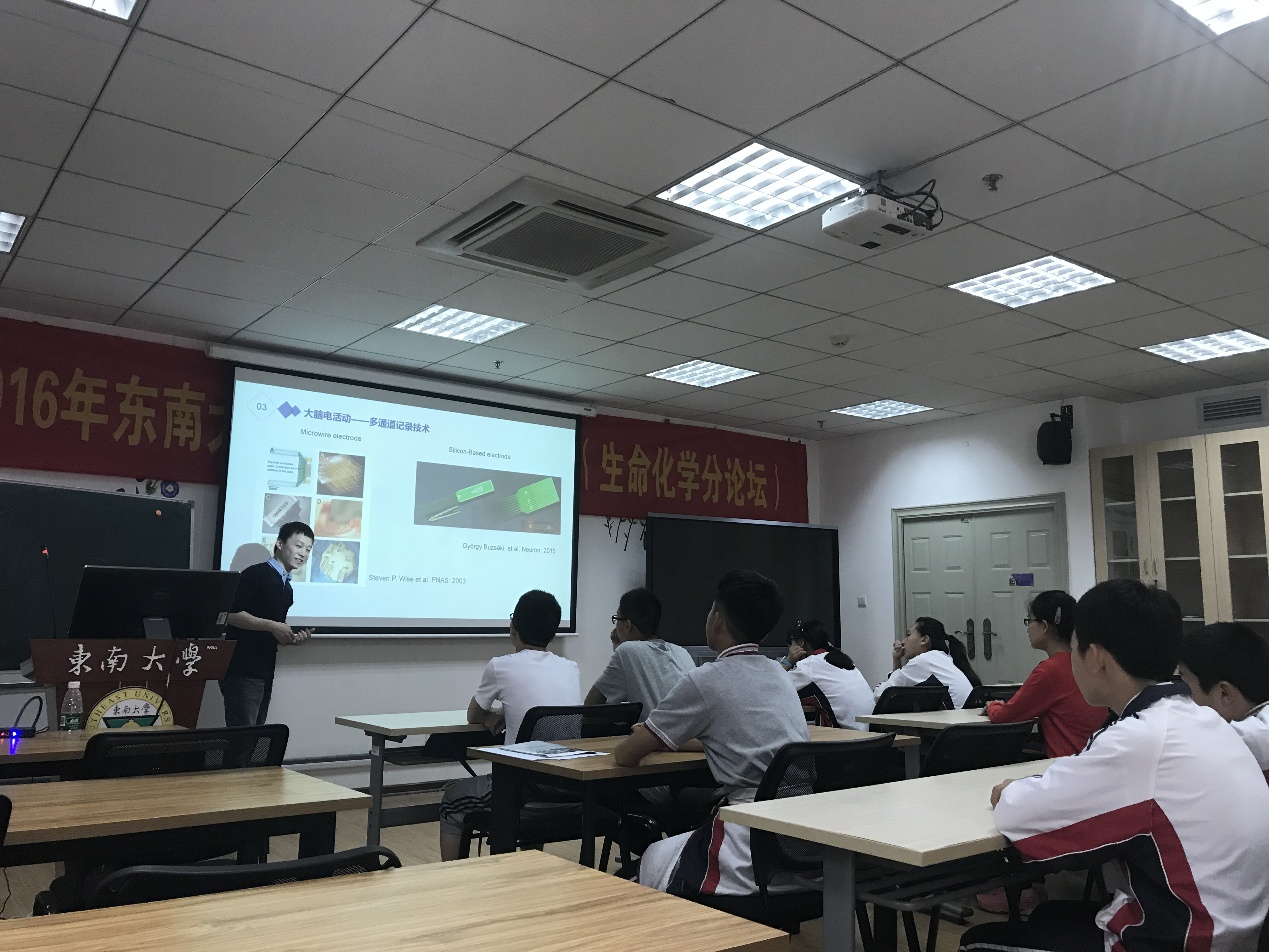 首先参观的是多通道电极制作的实验室。由实验室研究生为同学们介绍多通道记录技术中的微丝阵列电极的制作方法、工艺流程等等。同学们在显微镜下观察到了微丝阵列电极的尖端形态,微观结构。经过研究生的讲解,同学们明白了阵列电极工作的最基本原理。由于初中同学还未学习电学知识,不具备电学上的很多基础概念,研究生巧妙地类比气压的概念,让同学们理解了电压的定义以及电流的流向等科学问题。