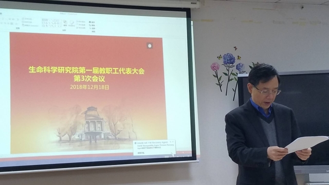 2018年12月18日上午,生命科学研究院第一届教职工代表大会第3次会议在李文正南楼会议室隆重举行。生命科学研究院全体在职教师出席了本次会议。会议由研究院直属党支部书记邱振清主持。