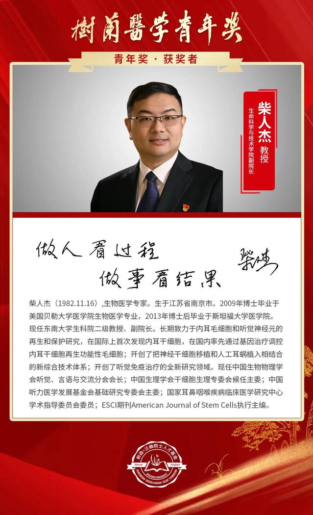 2021年11月20日,备受医学界、科技界、教育界瞩目的第八届“树兰医学奖”颁奖盛典在杭州良渚隆重举行。我院副院长柴人杰等12位青年医学科学家摘取“树兰医学青年奖”桂冠。全国人大常委会副委员长陈竺院士、树兰基金理事长郑树森院士和李兰娟院士等莅临指导大会并为获奖者颁奖。