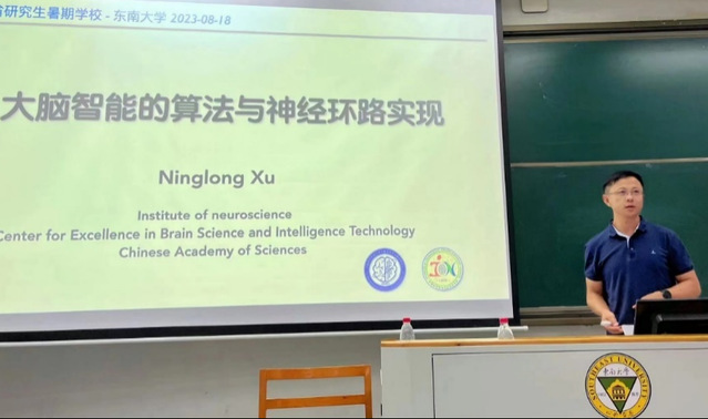 中国科学院神经科学研究所高级研究员徐宁龙以《大脑智能的算法与神经环路实现》为主题。徐宁龙研究员以图例形式生动形象的展示了大脑从感知到决策的智能算法的改变,谈及自己实验室相关研究进展:利用神经环路光学记录和光学操控技术,结合动物行为学范式,发现来自眶额叶的反馈信息支持听皮层对听觉分类标准的编码,这种神经环路运算符合基于任务状态推断的强化学习计算模型,可实现基于任务规则的灵活信息分类。最后,徐宁龙研究员介绍了如何在单神经元水平上完成整合任务规则与感知输入从而做出抉择的机制研究。总的来说,本次讲座内容丰富、深入、让同学们对于基于知识的灵活认知行为的神经环路运算原理有了初步认知。