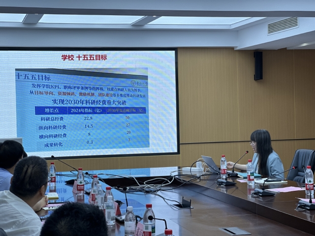 随后,副院长陈磊围绕“十五五”科研规划展开汇报。陈院长结合学院当前科研工作实际,深入剖析了在项目申报、成果转化、团队建设等方面存在的难点痛点,并针对性提出下一步发展建设目标。