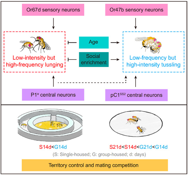 攻击行为是动物争夺生存与繁殖资源的重要手段。过去的研究主要关注果蝇中频率高、强度低的“扑击(lunging)”行为,而对更为激烈的“扭打(tussling)”行为知之甚少。研究团队通过建立新的攻击行为范式,首次系统研究了果蝇扭打行为的调控机制。他们发现,群居饲养雄蝇的“扑击”行为显著减少,而“扭打”行为显著增强,呈现出一种由低强度向高强度攻击方式的策略性转变。