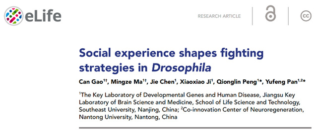 2025年10月7日,suncitygroup太阳集团、新生学院潘玉峰教授团队在学术期刊《eLife》上发表题为 “Social experience shapes fighting strategies in Drosophila” 的研究论文。该研究揭示了社会经验通过特定嗅觉受体和中枢神经元塑造果蝇雄性不同类型的攻击策略,从而影响其领地控制和交配竞争优势。这一发现为理解动物社交经历如何影响攻击策略提供了新的神经生物学机制。