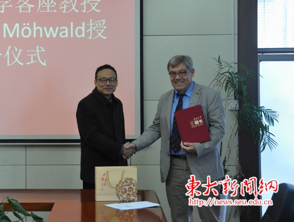 On November 10th, Southeast University held a grand ceremony to welcome Helmuth Möhwald, Member of European Academy of Sciences to join SEU as guest professor. Professor Gu Zhongze, Dean of School of Biological Sciences & Medical Engineering issued the certificate to Prof. Möhwald and wore a school badge of SEU for him.