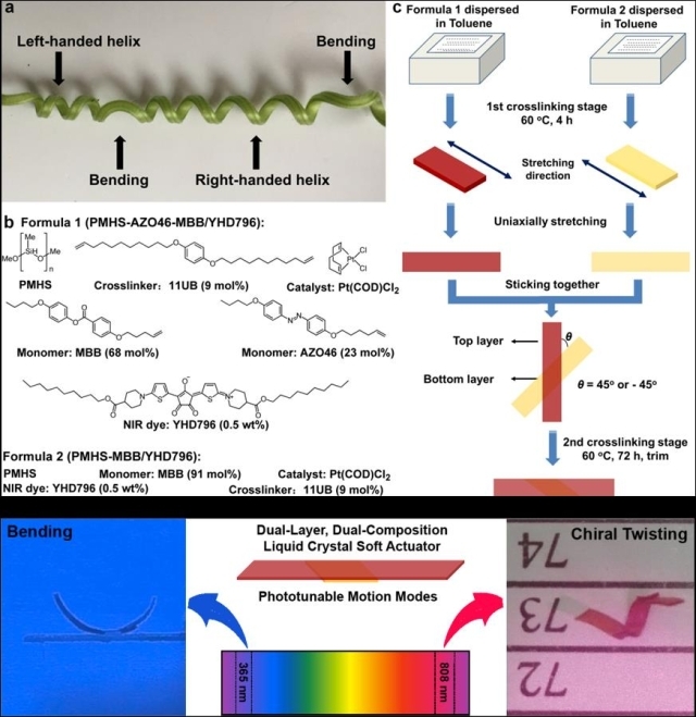 In nature, plant tendrils can produce two fundamental motion modes, bending and chiral twisting (helical curling) distortions, under the stimuli of sunlight, humidity, wetting or other atmospheric conditions. To date, many artificial plant-like mechanical machines have been developed. Although some previously reported materials could realize bending or chiral twisting through tailoring the samples into various ribbons along different orientations, each single ribbon could execute only one deformation mode. The challenging task is how to endow one individual plant tendril mimic material with two different, fully tunable and reversible motion modes (bending and chiral twisting). Yang’s group showed a dual-layer, dual-composition polysiloxane-based liquid crystal soft actuator strategy to synthesize a plant tendril mimic material capable of performing two different three-dimensional reversible transformations (bending versus chiral twisting) through modulation of the wavelength band of light stimuli (ultraviolet versus near-infrared). This material has broad application prospects in biomimetic control devices.